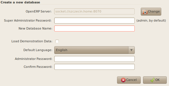 You will need to click on the Change button at the top to specify the name or IP address of the server. The port should be the default, 8070. Of course, if you have a firewall between the client and the server, the firewall configuration will need to be updated to allow traffic to the server through this port. The default password for the super administrator is admin as specified in the dialogue. Note that the database name cannot contain spaces, dashes or any non-alphanumeric characters.